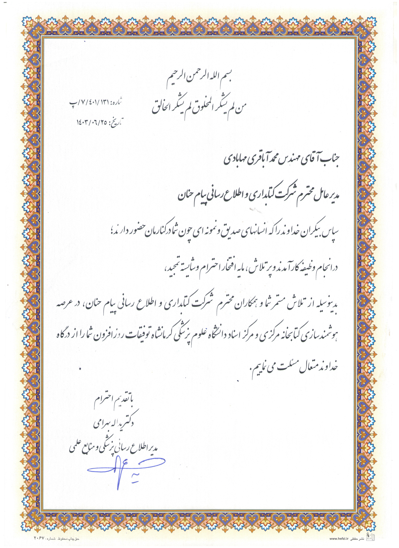 - لوح تقدیر کتابخانه مرکزی دانشگاه تهران